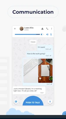 This application is designed to improve communication and productivity within a team. It allows users to quickly respond to unexpected events by transforming their smartphones into walkie-talkies with powerful messenger and communication features. This includes PTT (Push-To-Talk) for fast communication, individual and group calls, call recording, and the ability to share contacts, images, files, and locations. Users can also send and receive alerts through the app.