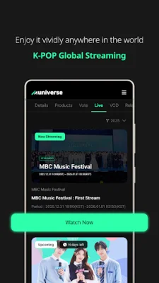 K-POP fans, get ready to have all your favorite experiences in one convenient place! Our application offers a variety of content and features that cater to every K-POP fan's needs and desires. Whether you're looking to stream concerts, participate in fan activities, or watch original K-POP shows and news, we've got you covered.