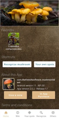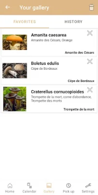 Another feature of this application is a photo gallery that is divided into two sections: "Favory" and "History". The "Favory" section allows users to save their favorite mushroom photos, while the "History" section keeps track of the user's past mushroom hunts.