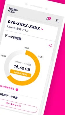 This application allows users to easily check their data usage, monthly fees, and contract plan details for their Rakuten Mobile service. With a simple glance at the graphs, users can see their remaining data and usage status. They can also view their daily data usage and communication fees for calls and SMS messages.