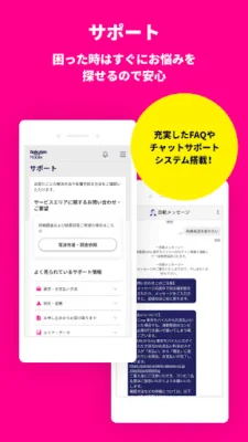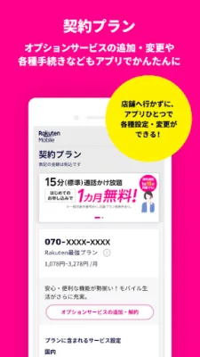 In addition to these features, the app also offers various other functions such as sharing on social media, setting up Rakuten points, changing email settings, and checking network speed. Users can also perform tasks like SIM card replacement, switching to another carrier, suspending service, and canceling their contract. They can also make payments through the app, view usage details, and manage payment methods. Other features include purchasing products and accessories, checking application history, and updating personal information through AI-powered identity verification.