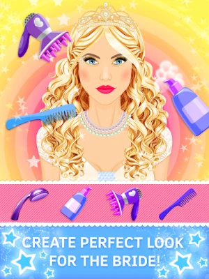 But it's not just about makeup, you also have to style the bride's hair. Wash, dry, and comb her hair using various styling tools and cosmetics. Then, try out different hairstyles until you find the perfect one for her special day. Choose from an enormous collection of tiaras, veils, and hats to complete the look.