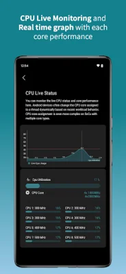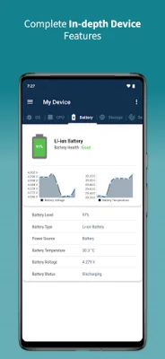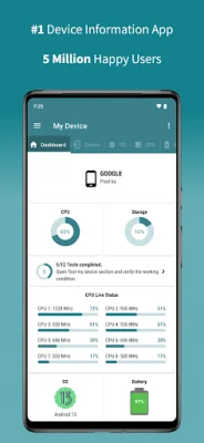 With this app, users can easily access information about their device's CPU, including memory usage, model, RAM usage, ABI, CPU variant, serial number, implementer, port, revision, and hardware model. They can also view details about their battery, such as type, health, level, power source, voltage, temperature, and status. The app also provides information about the device's storage, both internal and external, including used, free, and total storage.
