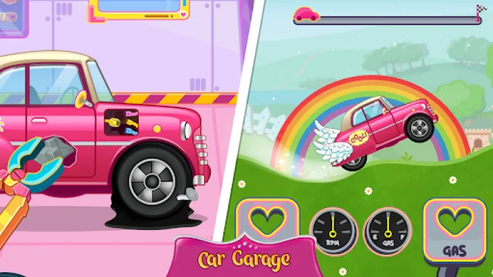 But wait, there's more! You can also visit the princess' car fixing and repairing garage. Learn how to repair, fix, wash, and paint cars like a pro. And after all the hard work, you can take the car for a spin and climb hills in style.