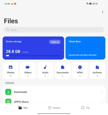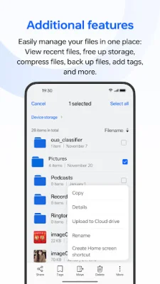 But that's not all, this application also offers additional features to help you manage your files in one place. You can view your recent files, free up storage space by compressing files, back up important files, and even add tags to your files for easier organization. With all these features, you can easily keep track of your files and access them whenever you need them.