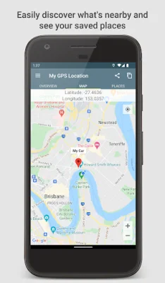 The MAP view allows users to easily explore nearby locations and view previously saved places, such as a favorite vacation spot or a parking location. New places can be added by long-tapping on the map, and existing places can be moved by dragging and dropping. The app supports various map types, including road maps and satellite imagery.