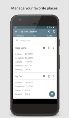 In the PLACES section, users can save, edit, and delete their favorite locations and see the distance from their current position. This feature is especially useful for travelers who want to know the distance from home while on a trip. The distance is calculated using the WGS84 ellipsoid.
