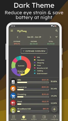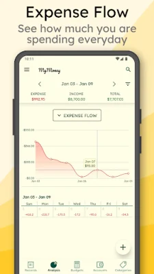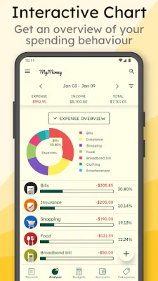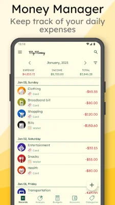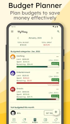 MyMoney is an application that helps users manage their money and track their expenses. It is a budget planner app that allows users to set monthly budget goals and effectively save money. The app is designed to be simple and easy to use, with customizable categories and multiple accounts for managing different types of expenses. It also features various analysis tools, such as charts and graphs, to help users better understand their spending habits. One of the key features of MyMoney is its customizable categories. Users can create and customize their own income and expense categories, with the ability to select icons, titles, and currency signs. This allows users to personalize the app and make it their own. The budget planner feature of MyMoney allows users to set monthly budget goals and track their expenses to ensure they do not exceed their budget. This helps users minimize their expenses and save money effectively. Additionally, the app features various analysis tools, such as income-expense pie charts and cash flow charts, to provide users with a better understanding of their spending habits. MyMoney also allows users to manage multiple accounts, such as wallets, cards, and savings, with no limitation on the number of accounts that can be created. This makes it easier for users to track their money and expenses in different categories. The app is designed to be simple and easy to use, with a user-friendly interface. It also features a quick homescreen widget that allows users to keep an eye on their balance and add expense records on the go. MyMoney is also fully offline, meaning no internet connection is required to use the app. To ensure the safety and security of users' data, MyMoney offers local backups and the ability to export worksheets for printing records. The app also has a Pro version with additional features that can be purchased. In terms of permissions, MyMoney only requires access to storage when creating or restoring a backup file. It also needs internet access for sending crash reports and improving the app, and the ability to run at startup for managing reminders. Overall, MyMoney is a comprehensive and user-friendly app for managing money and tracking expenses.