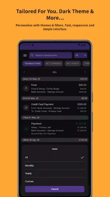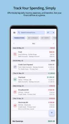 The application offers an easy-to-use interface that allows you to quickly log all your expenses, income, and account transfers. You can also view your complete transaction history and filter it by day, month, year, or custom date range. Additionally, you can search for specific transactions using keywords such as descriptions, notes, categories, and accounts.