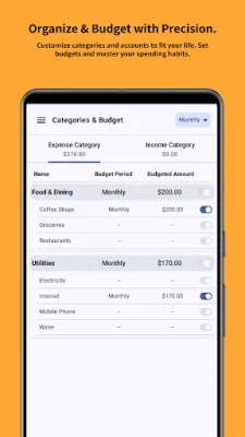 One of the key features of MyMoney Tracker is its budgeting tool. You can create realistic monthly or yearly budgets for main categories or specific sub-categories. The application also visually tracks your spending against your budget goals in the net earnings section. You can easily activate or deactivate budgets as needed, giving you more flexibility in managing your finances.