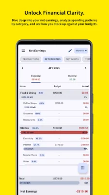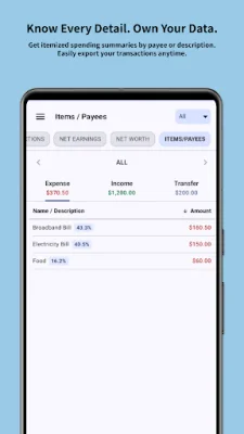 In addition to budgeting, MyMoney Tracker also offers powerful insights into your financial health. You can analyze your net earnings (income vs. expense) with detailed breakdowns by category. The application also allows you to track your net worth (assets vs. liabilities) and see how it changes over time. You can also identify your spending habits with summaries by item or payee.