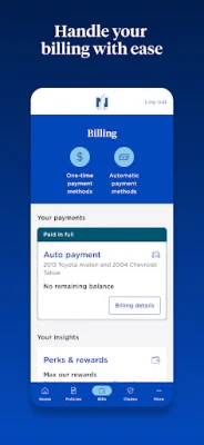 Other features of the app include the ability to quickly pay bills, add, edit, and delete preferred payment methods, and manage automatic payments. Users can also view, save, and share their auto, motorcycle, and pet insurance ID cards. The app also allows users to manage their auto policy, view and save policy documents for both auto and homeowners insurance, and access an accident checklist for steps to take in case of an accident.