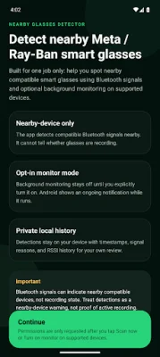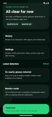 Privacy and control are also important aspects of the Nearby Glasses Detector. The app is designed for local use, and the scan history stays on the device unless the user chooses to share it. There is no required account, cloud sync, or complicated setup, making it easy for users to start their first nearby glasses scan.