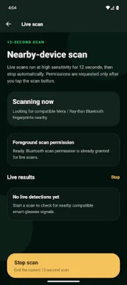 The app works by searching for Bluetooth signals commonly associated with smart glasses and similar devices. It can also show other nearby Bluetooth devices for more context. When a likely nearby glasses match is found, the result is highlighted, allowing users to check their surroundings and decide what to do next.