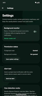It is important to note that the results of the Nearby Glasses Detector are not guaranteed, as they are probabilistic. Some nearby smart glasses may not broadcast detectable signals, and other Bluetooth devices may appear in the scan results for context. The quality of the scan can also vary based on phone hardware, Android version, and the environment. To improve scan results, users are advised to keep Bluetooth enabled, give the scan a few seconds to complete, and re-scan if they move to a new location.