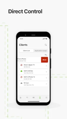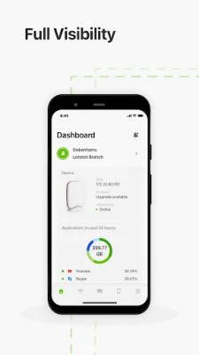 Once your networks are set up, you can enable or disable WiFi and share it with others through messaging or QR code. The app also allows you to view switch and gateway ports information, as well as monitor clients and their actions across your entire site. You can also analyze application usage and device status, both site-wide and per-device, with the option to take action if needed.