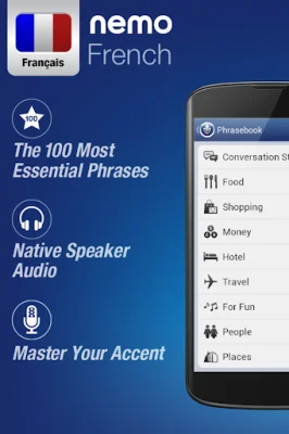 Nemo is a language learning application that focuses on helping users improve their French pronunciation and conversational skills. With high quality audio from a native speaker, users can listen to and practice pronouncing every French word clearly. The audio is downloaded to the device, making it available offline or in airplane mode for convenient learning anytime, anywhere. The app offers a unique feature called the Speech Studio, where users can record themselves saying a phrase and compare their pronunciation to that of a teacher's. This allows for quick improvement and correction of foreign accents. Nemo is designed to be used throughout the day, whenever there are a few spare minutes, making it easy to incorporate into daily routines. One of the standout features of Nemo is that no prior knowledge of French is required. The app is built around the most commonly used words and phrases in conversation, making it suitable for beginners, intermediate, and advanced learners. For beginners, there are lists of essential words and phrases to get started, while advanced learners can benefit from the Speech Studio technology to perfect their accent. Nemo also offers customizable flashcards to practice specific language skills, such as translation, recall, and pronunciation. Users can mark their favorite cards and use the Review Mode to recap what they have learned earlier in the day, boosting memory retention. In addition to language learning, Nemo also functions as a phrasebook and translator, making it a useful tool for travelers. It offers quick access to vocabulary through a French-English dictionary interface and supports a "Word Gender" mode to display extra information about the gender of words. French is one of the most widely spoken languages in the world, making it a valuable skill to have. With Nemo, users can not only improve their language proficiency, but also use their new skills to make friends, experience new cultures, and enhance their travel experiences. Download this free app now and start your French language journey!