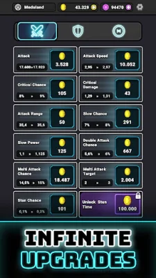 Neon Castle - Idle TD Game is an exciting and action-packed mobile game where players must build, upgrade, and dominate their neon castle against endless waves of enemies. With multiple towers to choose from, each with unique abilities and powerful ultimates, players must strategically construct their tower defenses and enhance them with special units called orbs. These orbs unleash devastating attacks to help players crush their enemies and defend their base. What sets Neon Castle apart from other idle tower defense games is its deep RPG gameplay. Players must research powerful technologies in the lab, unlock new towers, and experiment with different strategies to survive the increasing difficulty of enemy waves. Every decision matters, making it a true test of tactical skills. The game also features roguelike gameplay, adding an element of adaptability to the challenges. Each battle presents players with a set of game-changing cards, giving them different abilities and upgrades to choose from. With so many possibilities, every battle feels fresh and exciting. For those who love competition, Neon Castle offers a global leaderboard where players can climb their way to the top and prove their skills. In-game events also provide opportunities to win exclusive rewards that can make towers even stronger. The competition is fierce, making it an intense and thrilling experience. With its immersive apocalyptic world filled with neon enemies, Neon Castle offers an exciting and challenging gameplay experience for fans of tower defense, RPG, and idle strategy games. So if you think you have what it takes to build the perfect tower and defend your territory, download Neon Castle - Idle TD Game now and put your skills to the test!