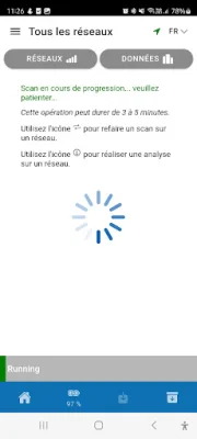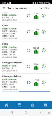 The next screen is the "networks" page, which allows users to scan and discover all the available networks in their area. This includes networks such as GSM, UMTS, LTE, LTEM, and NBIOT. Users can also export the scan data in a .csv file, which can be read in programs like Excel or Notepad. This feature is useful for those who want to keep track of their network connections and signal strength.