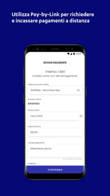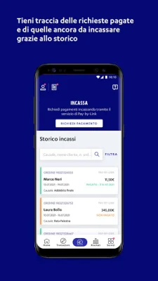 Inoltre, l'app ti permette di incassare pagamenti in modo semplice e sicuro. Potrai richiedere e incassare pagamenti a distanza dai tuoi clienti tramite servizi digitali come Pay-by-Link e tenere traccia dei pagamenti incassati e di quelli ancora in attesa di pagamento grazie allo storico dei link generati.