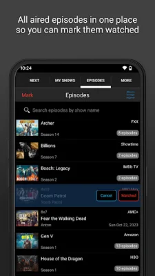 One of the main features of Next Episode is the "What's Next" section, which shows the TV shows from your list with a countdown to their next episode. This section is ordered by when the next episode will be aired. Another useful feature is the "Episodes" section, where new episodes from your shows will appear once they air. This is a great way to keep track of all unwatched episodes or episodes that you have not downloaded yet.