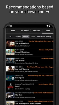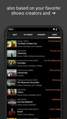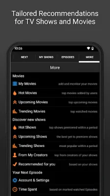 The "Discover" section of the app allows you to find new and awesome TV series and movies that you will like. You can browse through hot shows and movies, upcoming shows and movies, trending shows and movies, shows from your favorite creators, and personalized recommendations based on the shows and movies you already watch.