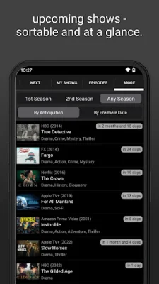 In the "Show Details" section, you can find more information about a TV series, including a picture, short description, channel, duration, trailer, next/previous episode info, and a schedule of seasons and episodes with summaries and air dates. You can also watch trailers for TV shows and easily discover new series that you will like.