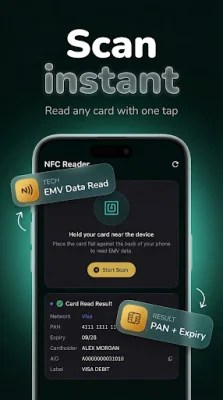 Using the NFC Card Scanner feature, you can easily scan any contactless bank or credit card and extract its data, including card number, expiry date, cardholder name, and card scheme. The app also provides a real-time animated NFC pulse indicator to show the scanning status. And the best part? It all works offline, ensuring that your data stays on your device.