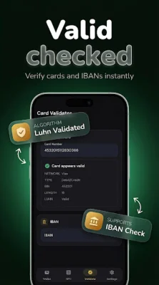 The app also includes a Standalone Card Validator & IBAN Checker, which allows you to validate card numbers using the Luhn checksum without NFC. You can also use the BIN lookup feature to identify the issuing bank, card type, and network from any card number. Additionally, the IBAN validator checks international bank account numbers for correct format and structure, giving you peace of mind before making any entries or sharing card numbers.