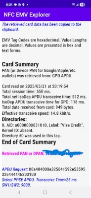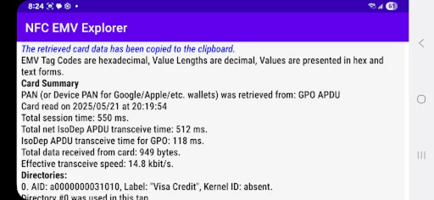 Contactless EMV technology is becoming increasingly popular as a way to make secure payments without having to physically swipe or insert a card. But how does it actually work and is it safe to use? Our NFC EMV Explorer app provides all the information you need to understand the inner workings of contactless EMV and assess any potential risks. By simply tapping your card, our app will display a detailed summary of the card's data exchange with the card reader, including the time it takes for the transaction to be completed. This includes information such as the card's PAN (or Device PAN for virtual wallets like Google or Apple Pay), the time and date of the transaction, and the total session time. In addition to this, the app also shows the APDU commands used during the transaction, such as selecting the PPSE (Payment System Environment) and the ADF (Application ID), as well as the GPO (Get Processing Options) and AC (Application Cryptogram) commands. This allows you to assess the card's offline data authentication capability. The output data is presented in a structured EMV Tag form, making it easy to understand and analyze. The app is not limited to physical cards, as it also works with virtual cards stored in Google, Apple, and other wallets on smartphones and watches. Our app is compatible with multi-application cards, meaning it can process multiple directory entries (EMV Tag 61) with each tap. It has been tested with various schemes including Visa, Mastercard, Interac, and eftpos (Australia), with partial testing for AmEx. One of the best things about our app is that it does not require any Android permissions, ensuring that your data remains safe and secure. The app also does not store or upload any data, but instead copies it to your clipboard for you to use as you wish. If you're unsure about purchasing the full version of our app, you can try the free NFC EMV Explorer - Entry Level, which provides limited data. So why wait? Download our app now and become an expert on contactless EMV technology.