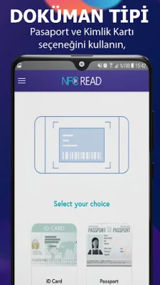Çip okuma işlemi için NFC butonuna tıklayarak pasaportunuzun ön ya da arka kapak bölümlerini cihazın NFC bölümüne yaklaştırmanız yeterlidir. Otomatik olarak NFC açılacak ve okuma işlemine başlayacaktır. Ayrıca çip özelliği olmayan pasaportları da tarayabilirsiniz. MRZ doğrulaması ile bilgilerin doğruluğu sağlanır ve pasaportun geçerlilik tarihi ve son 6 ay gibi uyarıları alabilirsiniz. Aynı anda pasaport üzerinde bulunan fotoğraf algılanır ve direk kesilmiş olarak alınır. Bu işlemler esnasında tarama yapılan pasaport sayfasının resmini kullanabilirsiniz.