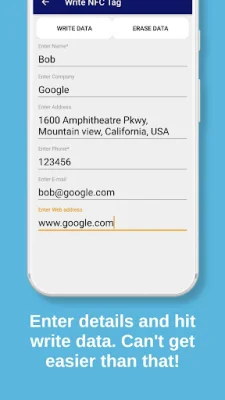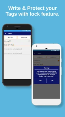 The "Write" tab in the app allows users to record standardized data such as simple text, links to websites, videos, social profiles, or apps, emails, contacts, phone numbers, SMS, application records, location, Bluetooth MAC address, Bitcoin data, and personalized data. To use NFC Reader & NFC Tag Writer, simply hold a tag or card against the back of your device to read it. The app also has a History section where all readings are saved for easy access.