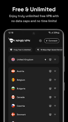 Ninja VPN is a free and unlimited virtual private network that offers high-speed connections for gaming, streaming, and browsing securely. With no sign-ups, payments, or limits, users can simply tap to connect and enjoy a fast, reliable, and private internet experience. This VPN stands out for its ultra-fast 10Gbps servers, top-tier privacy and security features, and global server locations.