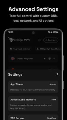 In addition to gaming and streaming, Ninja VPN also offers secure and private browsing. It protects personal data on public Wi-Fi and hides the user's IP address from trackers, ensuring safe and private internet access anytime, anywhere. The VPN also has smart features such as custom DNS support, split tunneling, and light and dark mode for total control and customization.