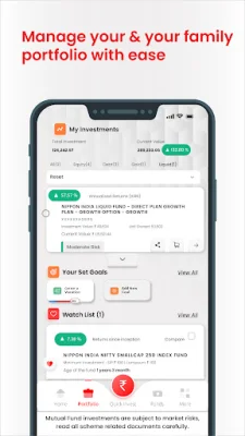 Experience an intuitive, personalized, and comprehensive Dashboard & Portfolio view. View consolidated portfolio with an in-depth & insightful view: • Easily track investments, returns, Lumpsum vs SIP view, and asset class distribution of portfolio • Receive smart prompts for key actions like SIP renewals, pending transactions, and other updates • Link family members' portfolios for a consolidated view and better goal management • Simplified fund discovery and faster decision-making