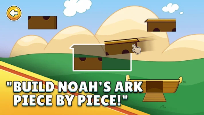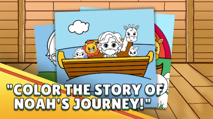 This application is designed for young children, specifically one to four year olds, to join Noah on an adventure to build the ark and gather animals to save them from a great flood. Along the way, children will also learn about God's love. The app offers a variety of activities for children to engage in, including a puzzle game to build the ark and cages for the animals, a hide-and-seek game where they can drag animals into the ark as they hide behind objects, and coloring pages featuring Noah, the ark, and various animals in their habitats.