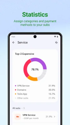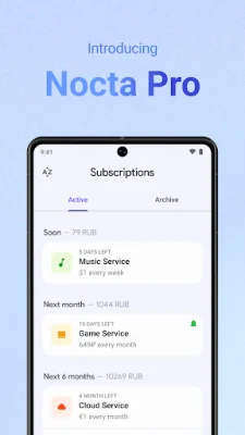 Nocta Pro is a subscription management application that offers a variety of features to help users keep track of their expenses and optimize their spending. The app includes basic sorting and filtering options for subscriptions, as well as a convenient calendar that displays upcoming payments on a monthly and yearly basis. Additionally, Nocta Pro offers advanced statistics and analytics with charts and tips to help users reduce their spending.