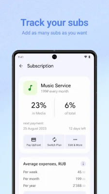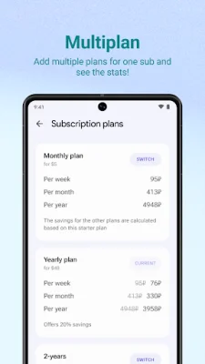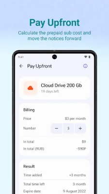 The app also offers a "Pay Upfront" feature, which calculates the cost of paying for a subscription for multiple cycles in advance. This can be useful for planning and budgeting, such as pre-paying for a cell phone plan for several months.