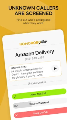 When an unknown caller rings your phone, Nomorobo Max will ask for their name and the purpose of the call. You can then listen to a brief message and choose to accept, reject, or send the call to voicemail. The service also cross-references the incoming number against a global database of scam phone numbers and screens the caller's dialogue for common scamming terms and language patterns.