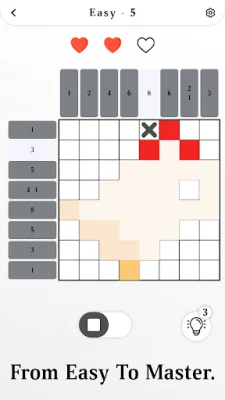 Nonogram is a fun and challenging game that will put your puzzle-solving skills to the test. The objective of the game is to uncover hidden pixel pictures by matching blank cells and numbers on a grid. With its simple gameplay, all you need to do is use logic and deduction to reveal the hidden picture and advance to the next level.