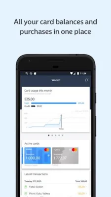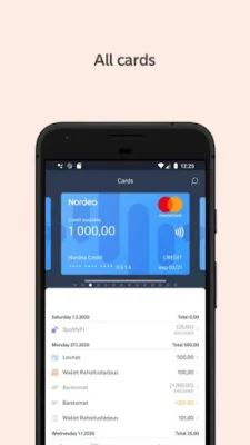 Nordea Wallet on kätevä sovellus, jonka avulla voit helposti seurata kaikkien korttiesi saldoja, käteisnostoja ja korttimaksuja. Sovellus ilmoittaa sinulle jokaisesta korttiostoksestasi, myös verkko-ostoksista ja automaattisista veloituksista. Voit myös nähdä ostostesi luokittelun kuukausiyhteenvedossa. Kaikki tapahtumat päivittyvät välittömästi, joten voit aina tarkistaa korteillasi olevan saldon juuri tällä hetkellä.