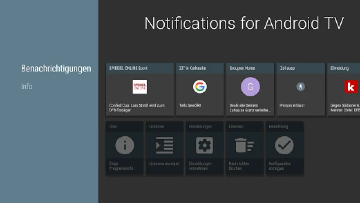 This application allows users to view and manage their notifications on their Android TV in fullscreen mode. It is compatible with a variety of apps, including messenger apps like WhatsApp and SMS, as well as news apps like Spiegel Online and SWR3. It also displays incoming and outgoing calls. To use this app, users must first install 'Notifications for Android TV' on their Android TV or Google TV.