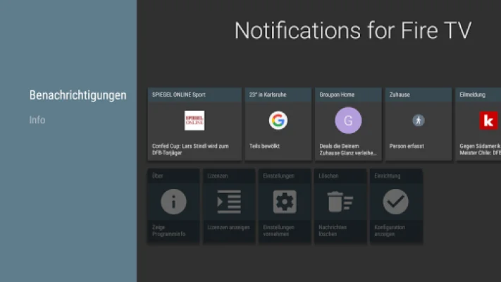 This application allows you to view all of your notifications on your Amazon Fire TV in fullscreen mode. This includes notifications from various apps such as messenger apps like WhatsApp and SMS, as well as news apps like Spiegel Online and SWR3. It also displays incoming and outgoing phone calls. You can customize the settings for each individual app, making it a versatile tool for managing your notifications.