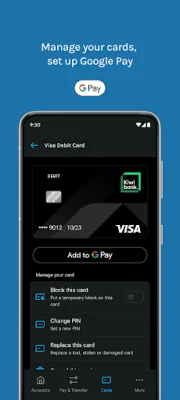 The app also allows you to easily manage your cards. You can set up Google Pay for contactless payments, change your PIN, block or unblock your cards, and even replace lost, stolen, or damaged cards. You can also cancel your EFTPOS and Visa Debit Cards through the app.