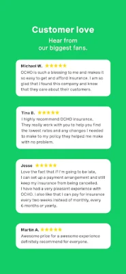 OCHO works with several reputable insurance companies, including Progressive, Dairyland, Gainsco, National General, and more. And unlike other insurance apps like Hugo Insurance, OCHO offers continuous coverage and flexible payment plans, ensuring you are always protected without any gaps in coverage. OCHO is not a payday loan service, cash loan, personal loan app, or a platform for borrowing money. They also do not use telematics.