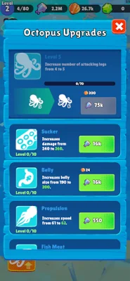 In this game, you will face epic battles against mighty predators that will test your strategic skills. Only the strongest octopuses will survive and thrive in these underwater battles. You are the main character in this Ocean Odyssey: Idle RPG game, and it's up to you to unleash your full power and emerge victorious!
