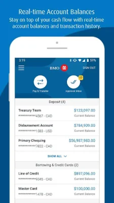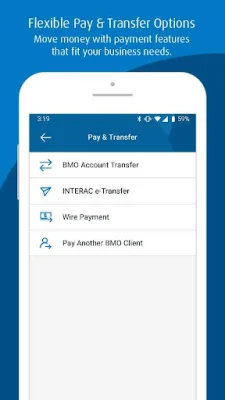 Biometric Security is an application that allows you to verify your identity using biometric identification, such as your fingerprint. This provides a secure and convenient way to sign in to the app. With this app, you can also monitor your cash flow in real-time by checking your account balances and transaction history. It also offers helpful insights to manage your cash flow effectively. Additionally, you can quickly search for specific transactions within the app. The app also allows you to send and receive payments in various ways. You can instantly transfer money between your accounts or pay off your BMO corporate card balances. For Canadian users, you can also use INTERAC e-Transfer to send or receive transfers and pay money requests. You can also make wire payments using your company's beneficiary list or templates, and even deposit money into another BMO client's account instantly. For Canadian users, you can also make same-day tax and bill payments, while U.S. users can use Zelle to send payments. Mobile approvals are also available on the app, allowing you to view and approve pending approvals for various services. This includes wire payments, account transfers, INTERAC e-Transfers, electronic funds transfers, automated clearing house payments, and more. You can also manage your users through the app by unlocking them or resetting their passwords. To use this app, you must be registered for BMO Online Banking for Business. You can use the same credentials you use to sign in on your computer. If you are not a client of BMO Online Banking for Business, you can visit their website for more information. It is important to note that by using this app, you are consenting to the app communicating with BMO's servers, affecting app-related preferences or data on your device, and collecting personal information as outlined in their privacy policy. You can withdraw your consent at any time by uninstalling the app. This app is a registered trademark of Bank of Montreal and uses INTERAC e-Transfer under license.
