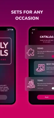 Our app offers 8 different thematic sets and 6 categories with over 900 tasks to choose from. Each set is designed to cater to different preferences and personalities. For those who are feeling daring and want to brag about their sexual achievements or even get naked, the "Sexy Party" set is the perfect choice. Want to test your friendship? Choose the "Toxic" set and spill the tea, talk about exes, and reveal annoying secrets. And for those who are always working and need a break, we have the "Real Adults" set that might just make you change your mind and take a day off. With so many options, you can download the app and choose your favorite sets to play with your friends.