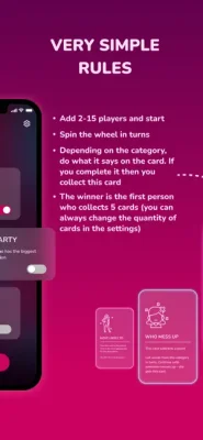 The main rules of the game are simple. Add 2-15 players, spin the wheel in turns, and depending on the category, complete the task on the card to collect it. The first person to collect 5 cards wins (you can adjust the number of cards in the settings). It's that easy! There are 6 categories of cards, each with a different task type. Let's take a closer look at them.