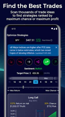 In addition to the Strategy Visualizer, this application also features a Strategy Optimizer. This tool automatically calculates the best strategies based on a target price and expiration date. By searching through thousands of potential trades, the options optimizer can determine which strategies will maximize returns or increase the chance of profit.